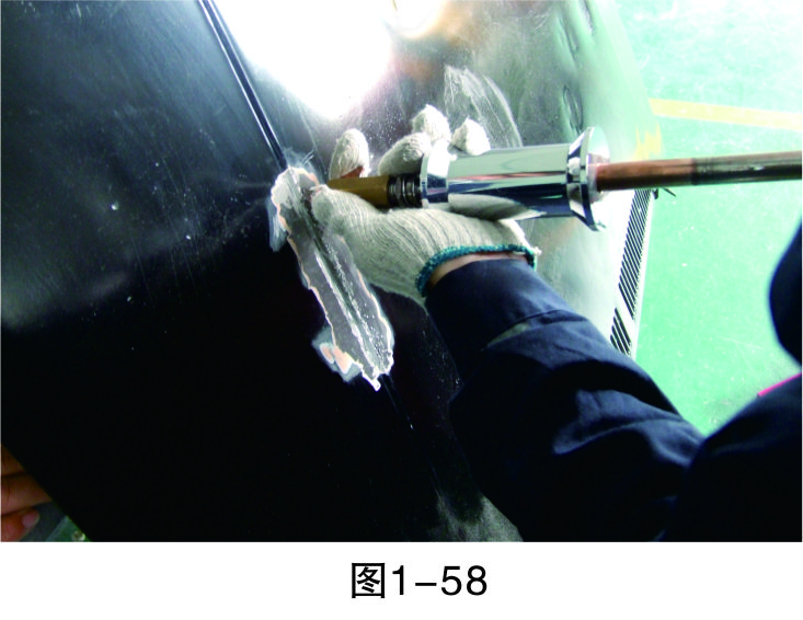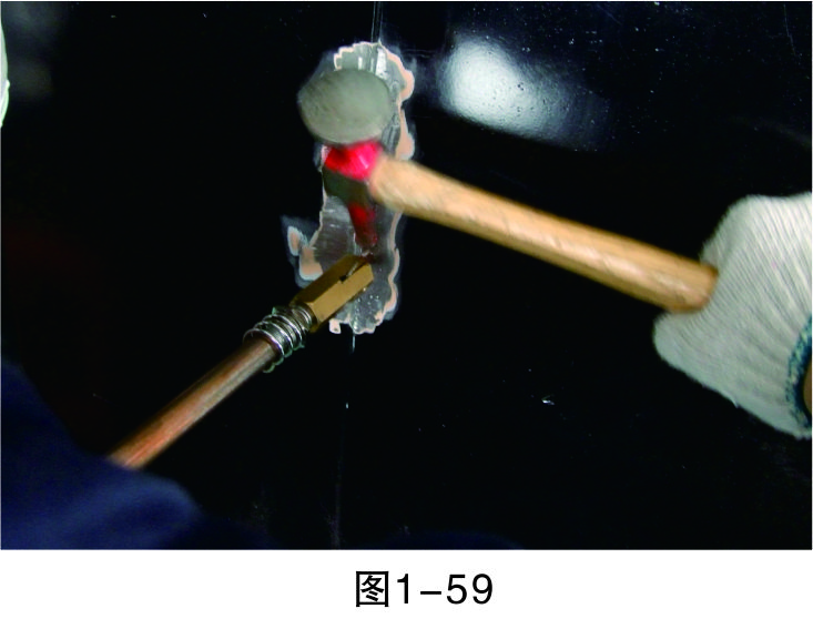 步驟18(拉低打高):對相對低的位置進行拉伸,對相對高的位置進行敲擊,要注意焊拉槍與鈑金錘的配合,重點是把握好力度,如圖1-59所示。