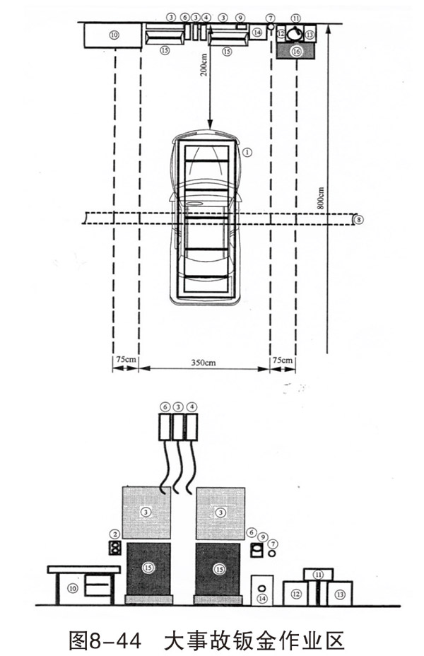 損傷修復(fù)和焊接作業(yè)區(qū)域可各設(shè)置 4~6個工位,每個工位的面積約400cm×800cm,每個工位配相應(yīng)的設(shè)備和操作臺(架)。車身校正作業(yè)一般設(shè)一個工位,面積500cm×800cm。如條件允許,可以根據(jù)不同類型的校正架,設(shè)置2~3個工位。