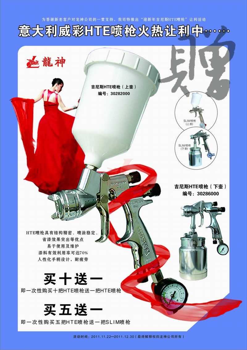 吉尼斯HTE噴槍11月促銷 吉尼斯HTE噴槍2011年11月促銷 (活動已結(jié)束,感謝您的關(guān)注) 一、主題: 吉尼斯HTE噴槍讓利促銷 二、活動目的: 讓利回饋給力促銷 三、活動時間: 1、 時間:2011年11月21日至2011年12月30日 2、 時長:共計40天 四、活動內(nèi)容: 1、 買十送一(即一次購買十把HTE噴槍送一把HTE噴槍) 2、 買五送一(即一次購買五把HTE噴槍送一把SLIM噴槍) 市場部 2011年11月17日 宣傳海報 2011-11-19 12953