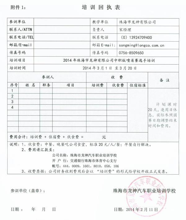 為了響應國家“企業(yè)應該積極融入和參與職業(yè)教育事業(yè)”的號召,讓部分參賽條件和設(shè)施不足的學校也能參加技能大賽,促進全國中職技能大賽在全國的快速和均衡地發(fā)展,珠海市龍神有限公司憑借自身20多年的汽車鈑噴行業(yè)經(jīng)驗和設(shè)備技術(shù)優(yōu)勢,定于2014年3月1日至3月20日在珠海舉辦為期20天的汽車車身修復與涂裝技能大賽選手培訓,具體方案如下: